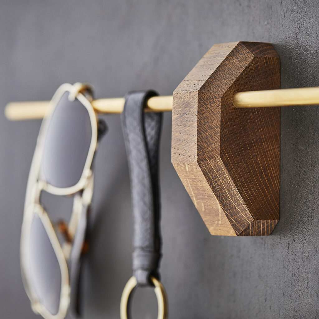 Level er en moderne eksklusiv holder til accessoires. Den er en anelse større end Essentials og egner sig til lidt større accessoires som f.eks. solbriller, hundesnoren, nøgler eller større smykker. Messingstangen længde er 40 cm. Den er en smule tykkere end Essentials så den passer til egetræets størrelse. Skjulte beslag og skruer til ophæng medfølger.